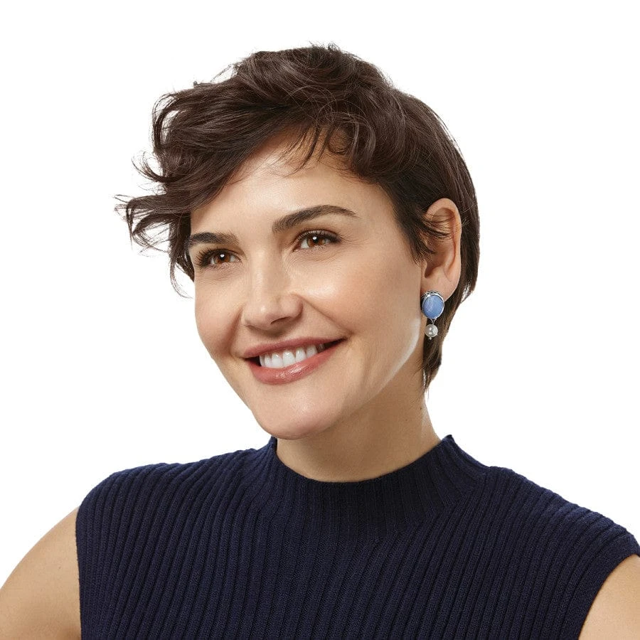 Inspired by the moon, these earrings feature stones that are hand-set glass that is handcrafted in Germany and encased in clear gloss for luminosity. Pearl dangles give them a wear-forever classic touch.