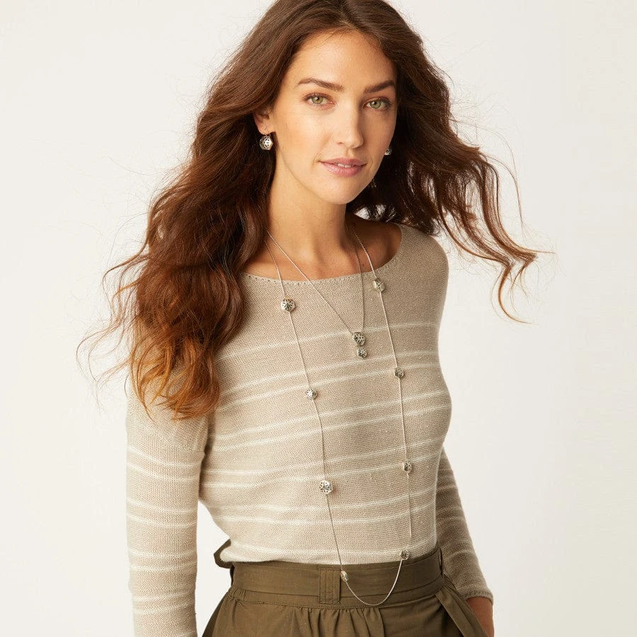 Inspired by the 500-mile, 1,000-year-old pilgrim’s path to the Cathedral of Santiago in northern Spain. Our designer tells us that the pierced patterns represent the numerous beautiful churches that dot this ancient route. A great piece for layering.